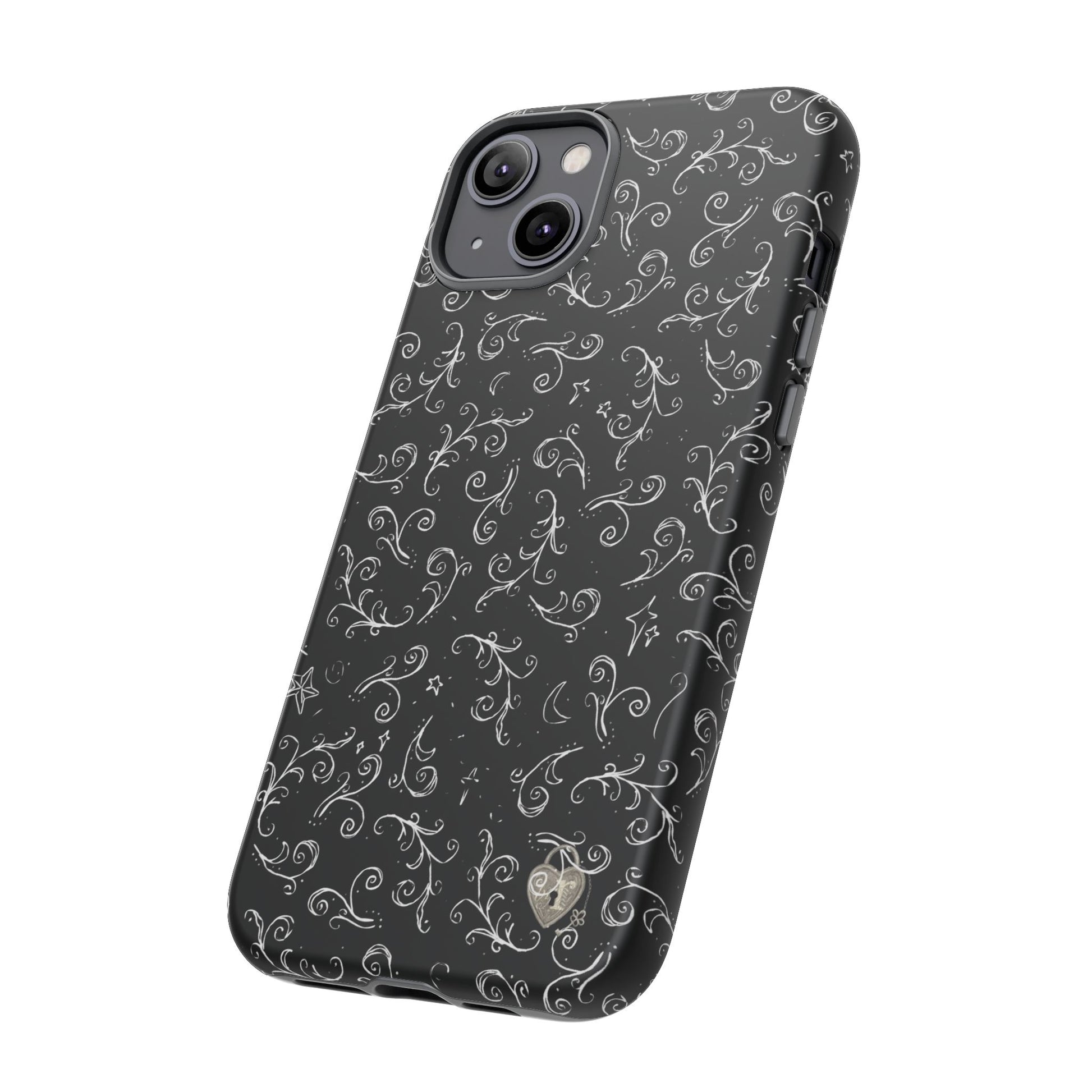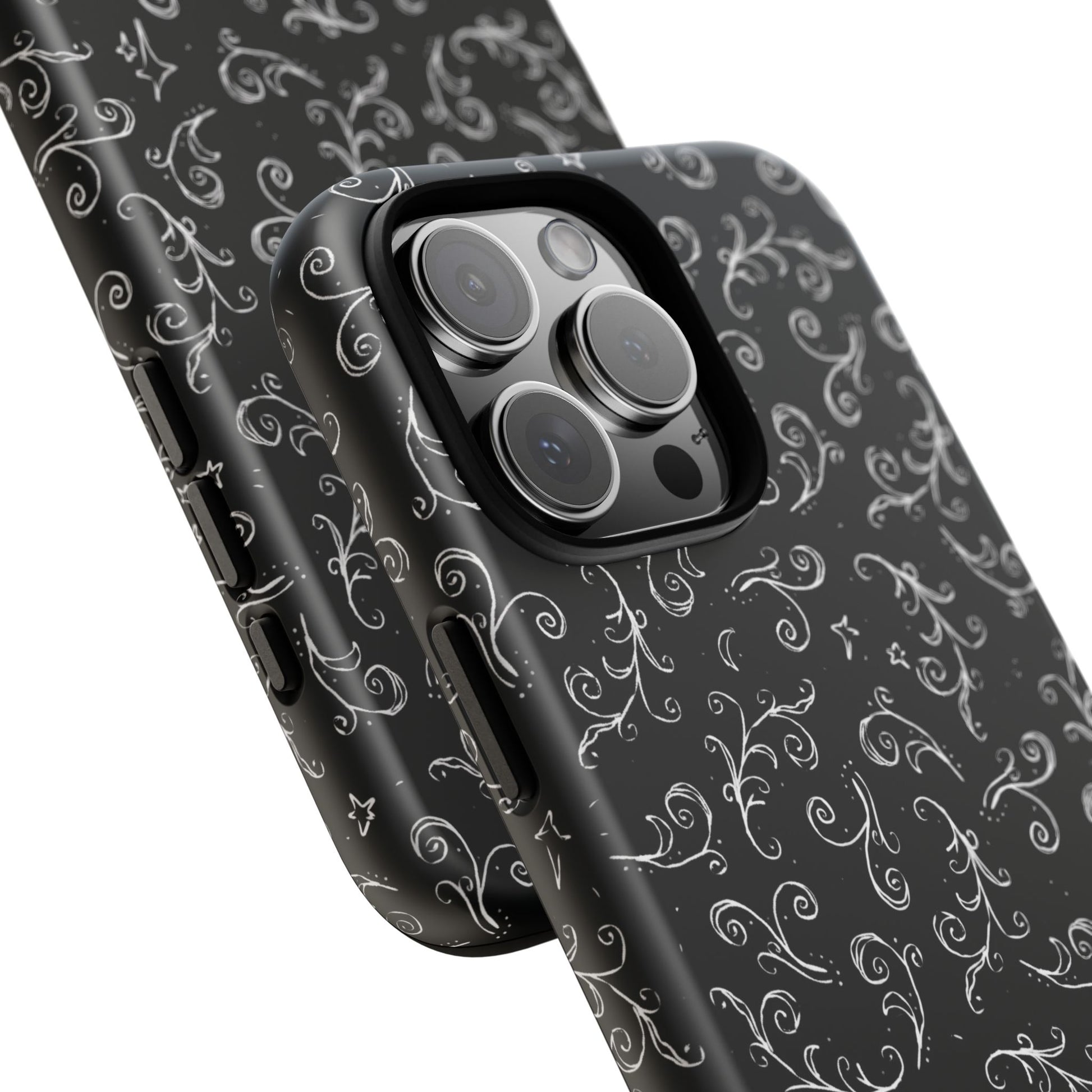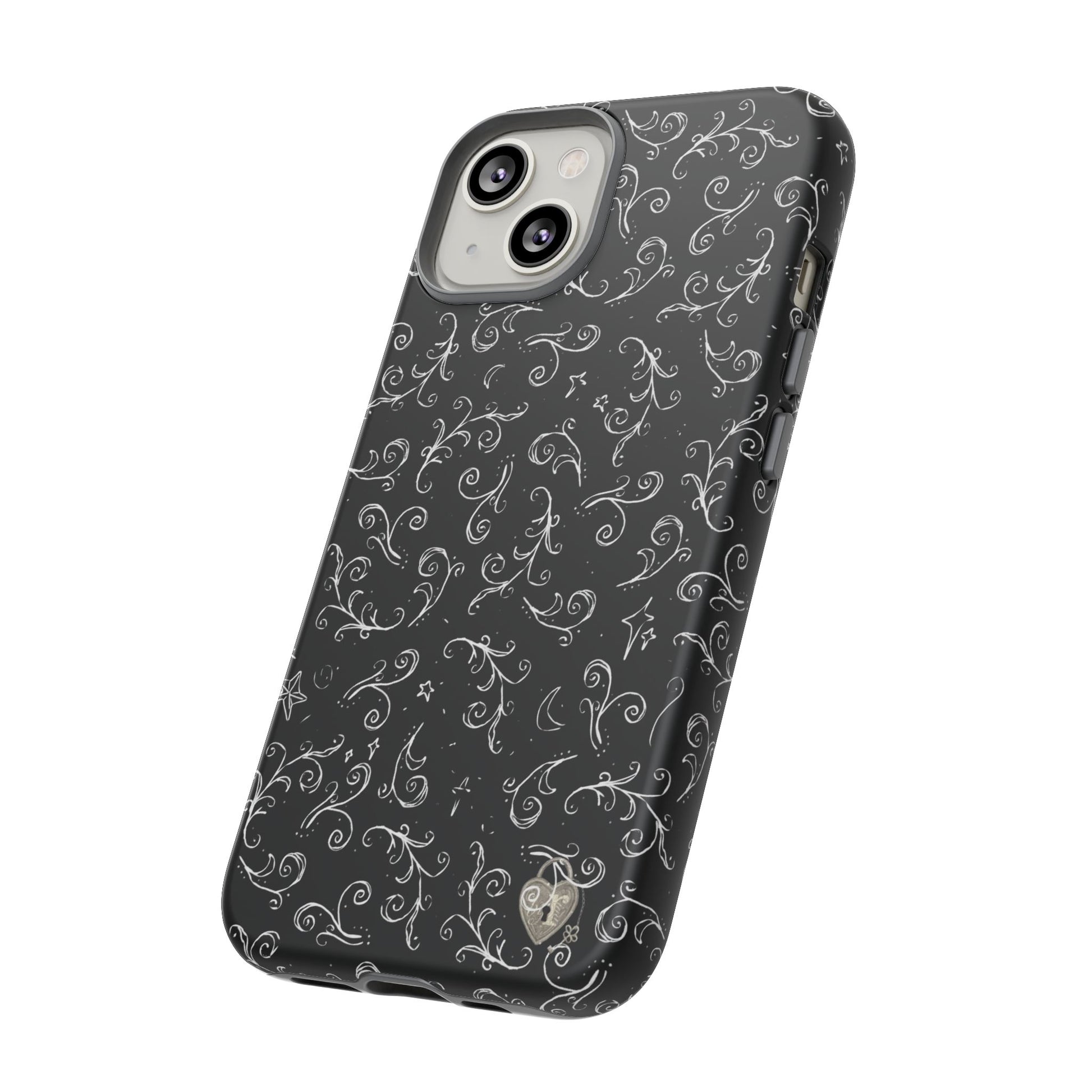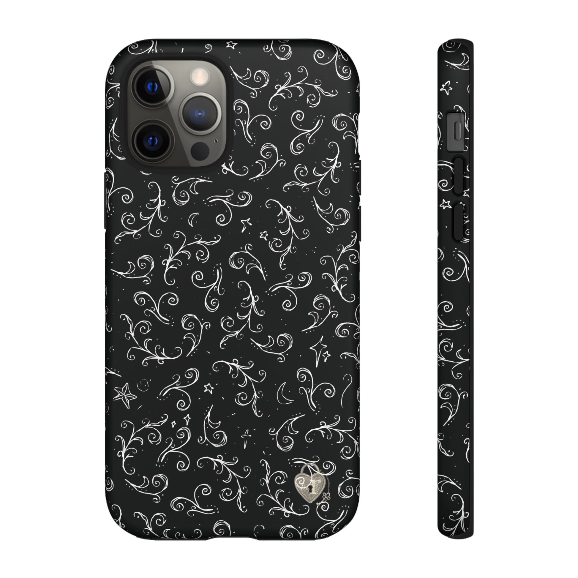 A dark case featuring a swirly and elegant design, alongside small celestial inspired shapes. This case comes in a matte or glossy finish, and sheilds against drops whilst also keeping wireless charging accessible.