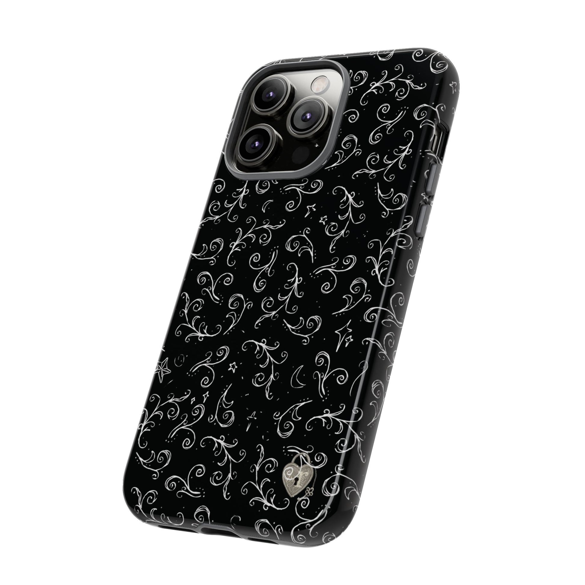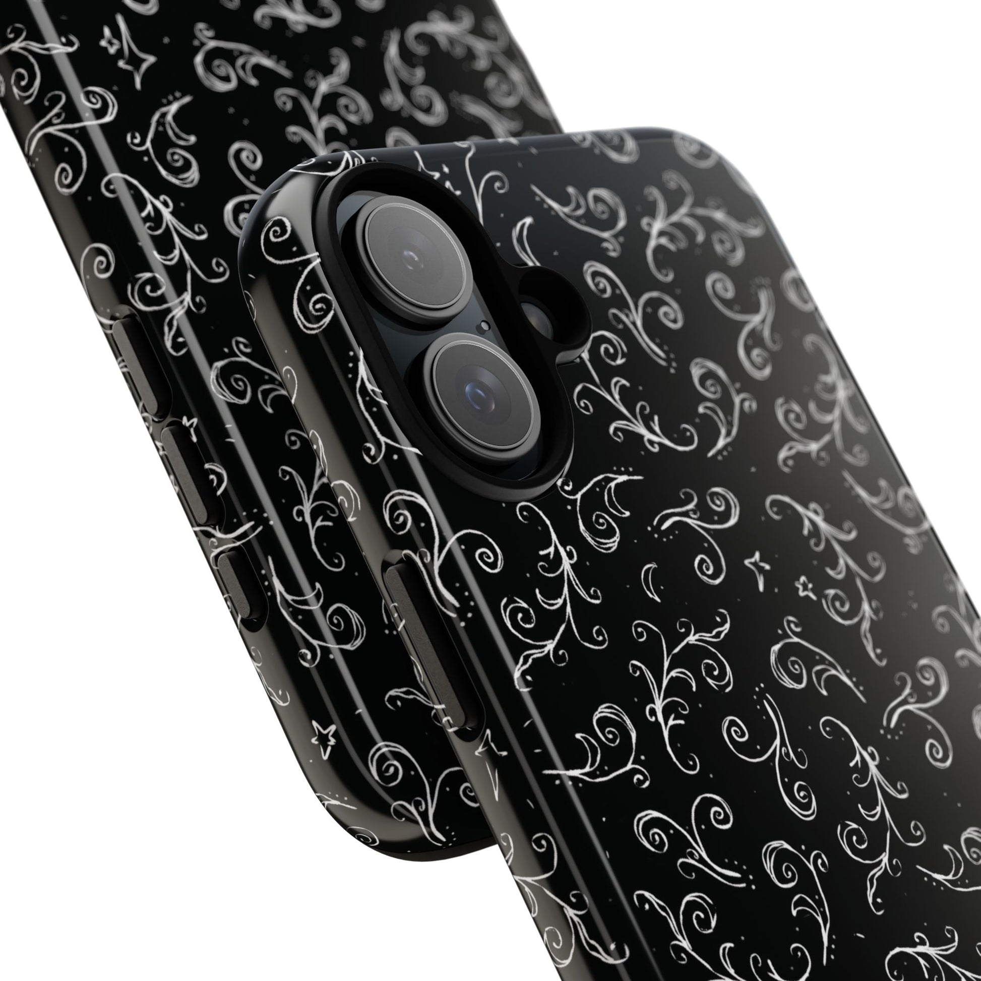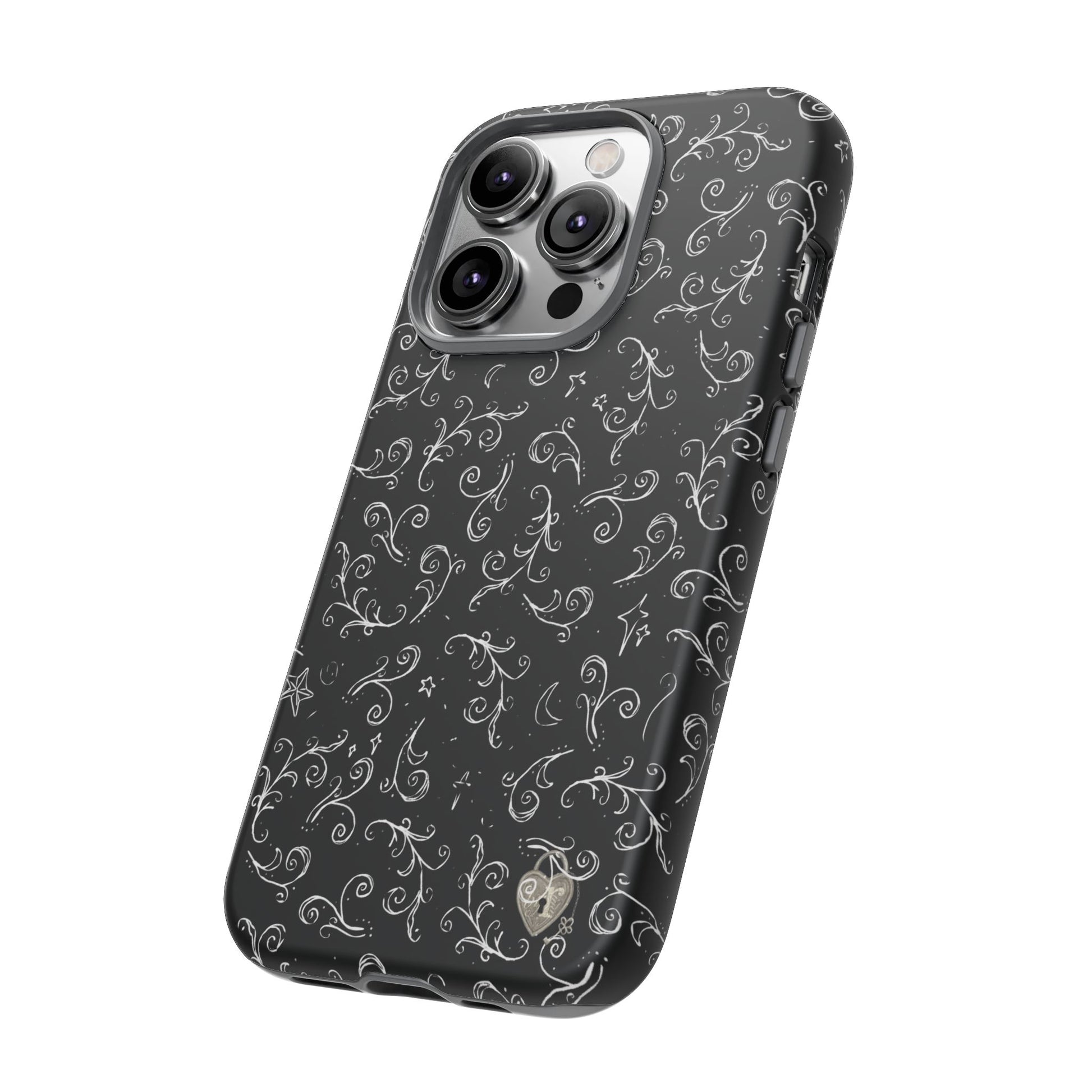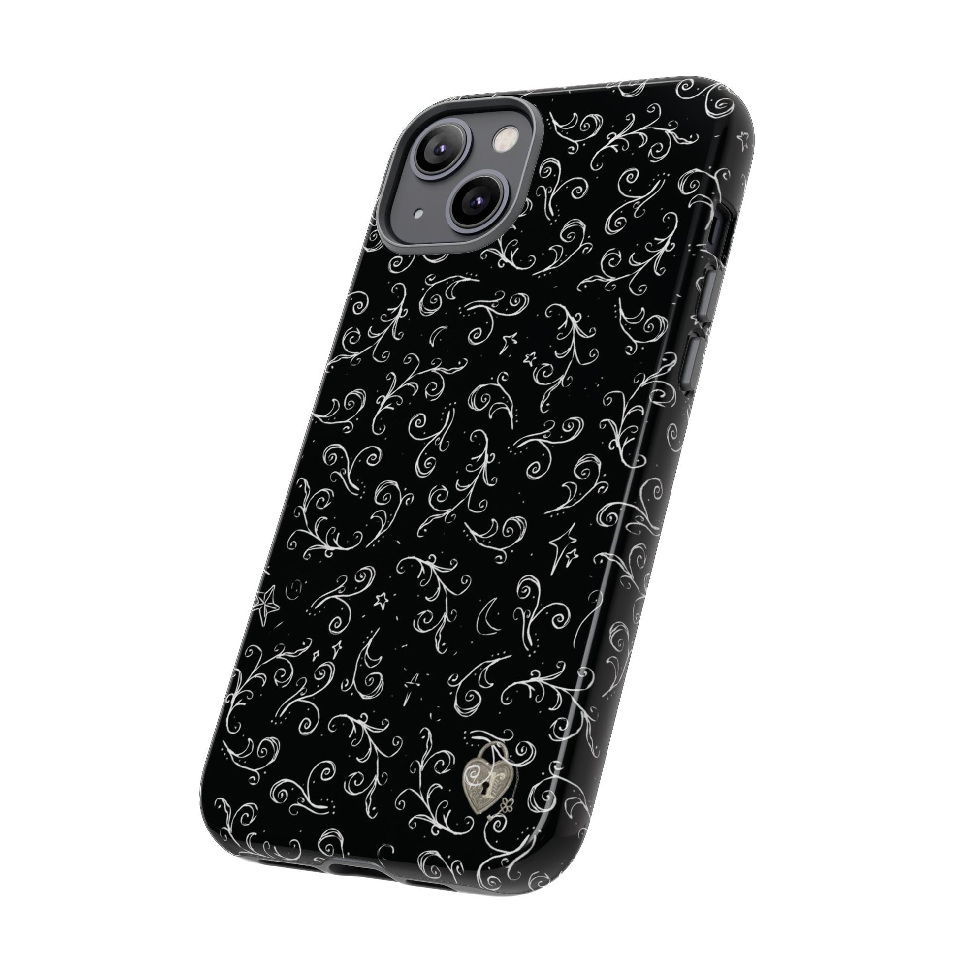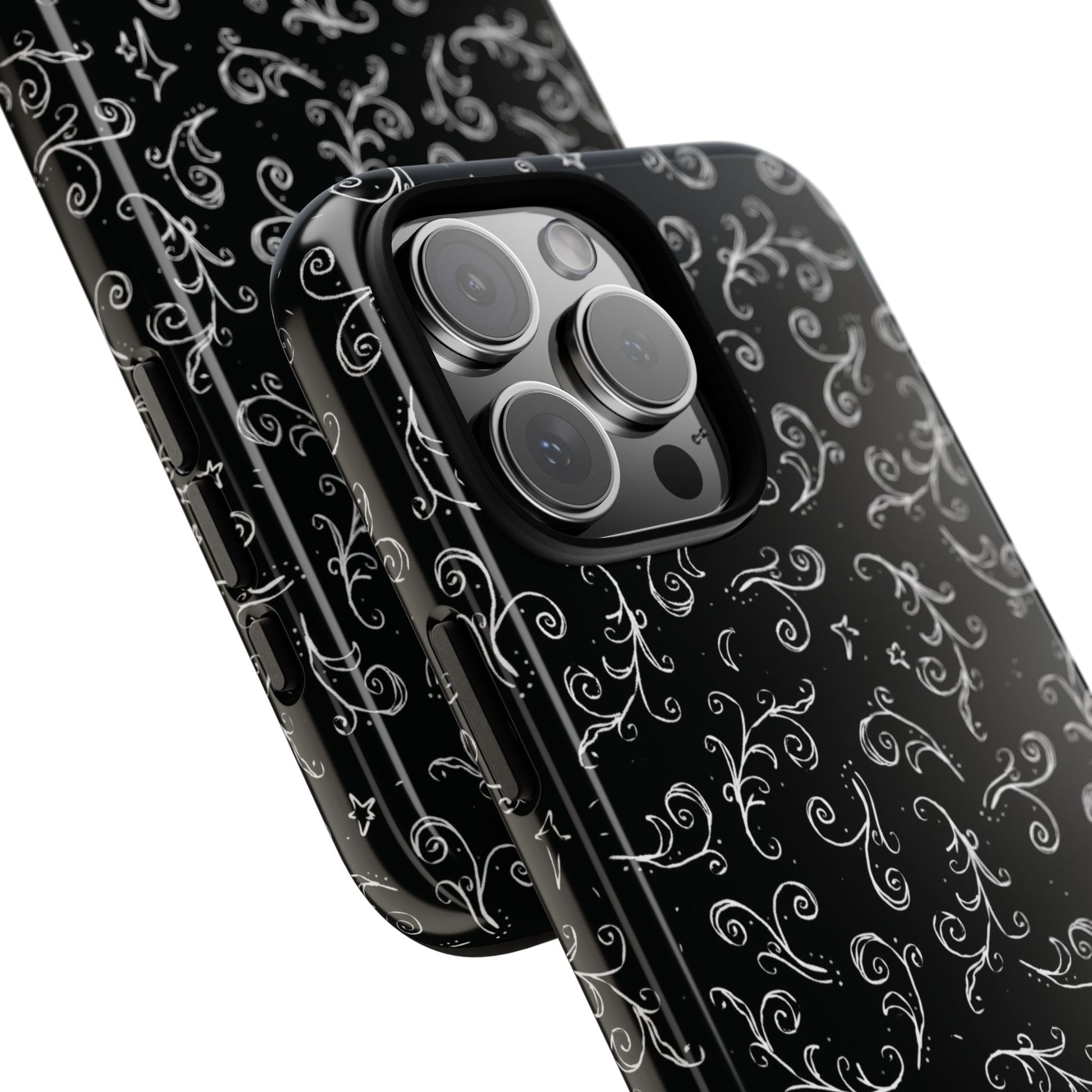 A dark case featuring a swirly and elegant design, alongside small celestial inspired shapes. This case comes in a matte or glossy finish, and sheilds against drops whilst also keeping wireless charging accessible.