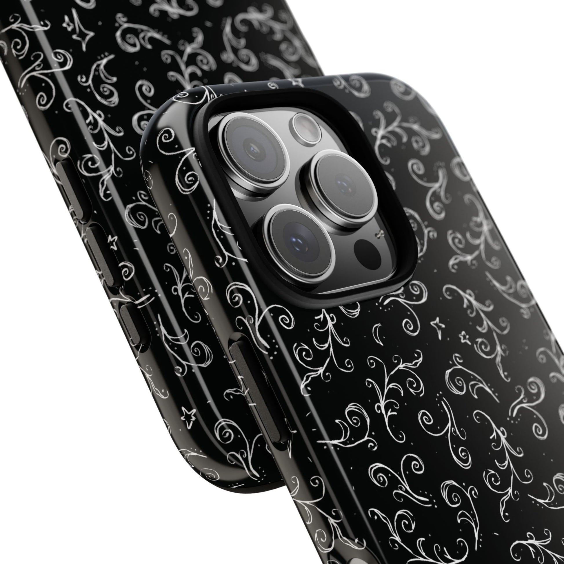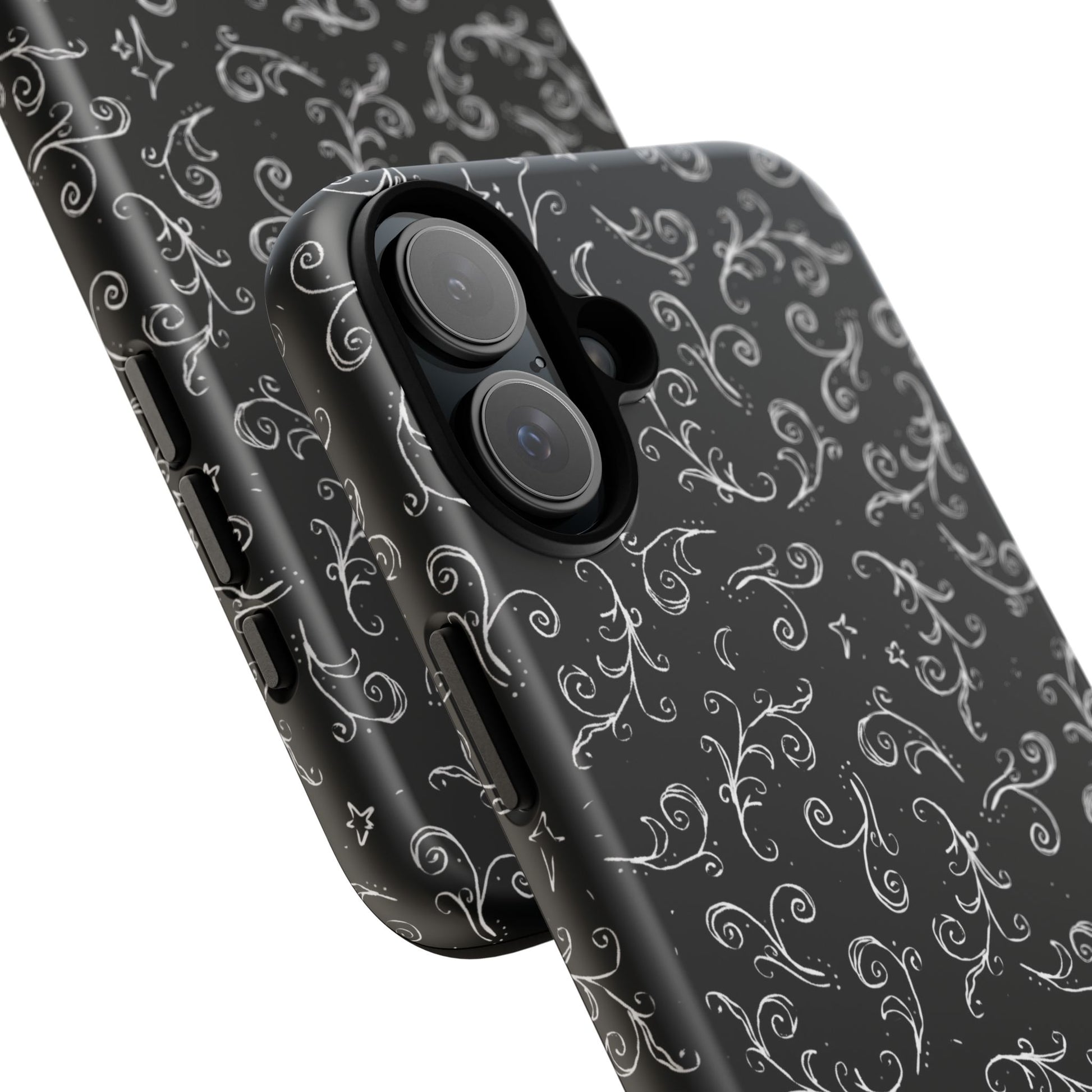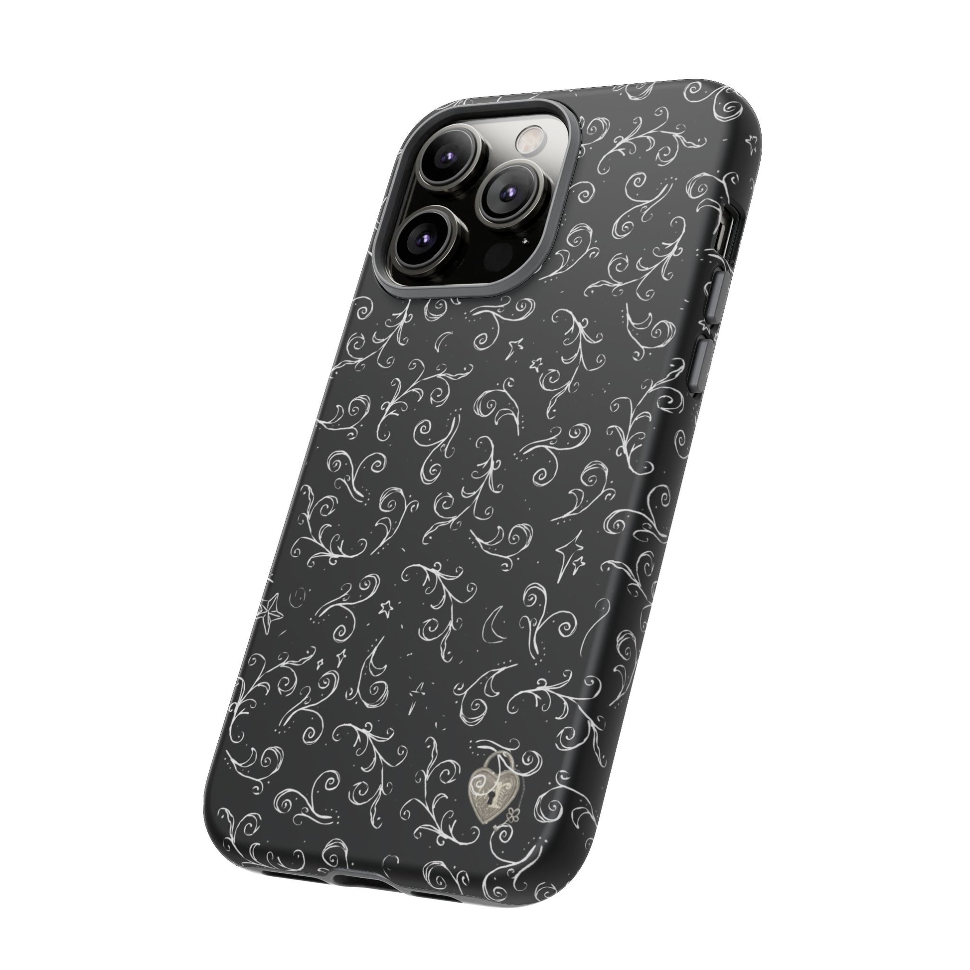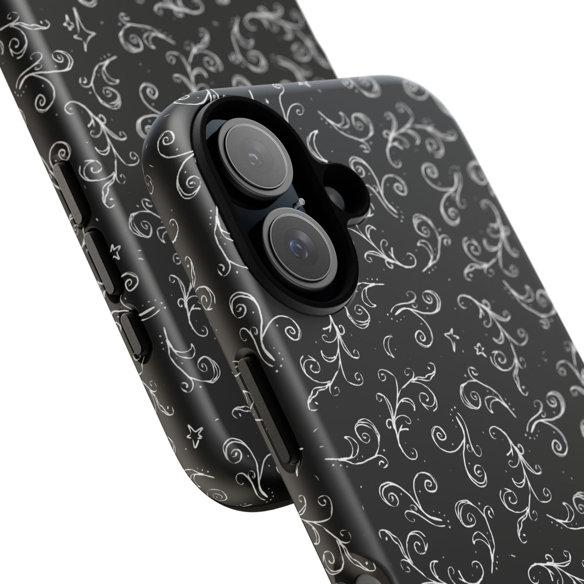 A dark case featuring a swirly and elegant design, alongside small celestial inspired shapes. This case comes in a matte or glossy finish, and sheilds against drops whilst also keeping wireless charging accessible.