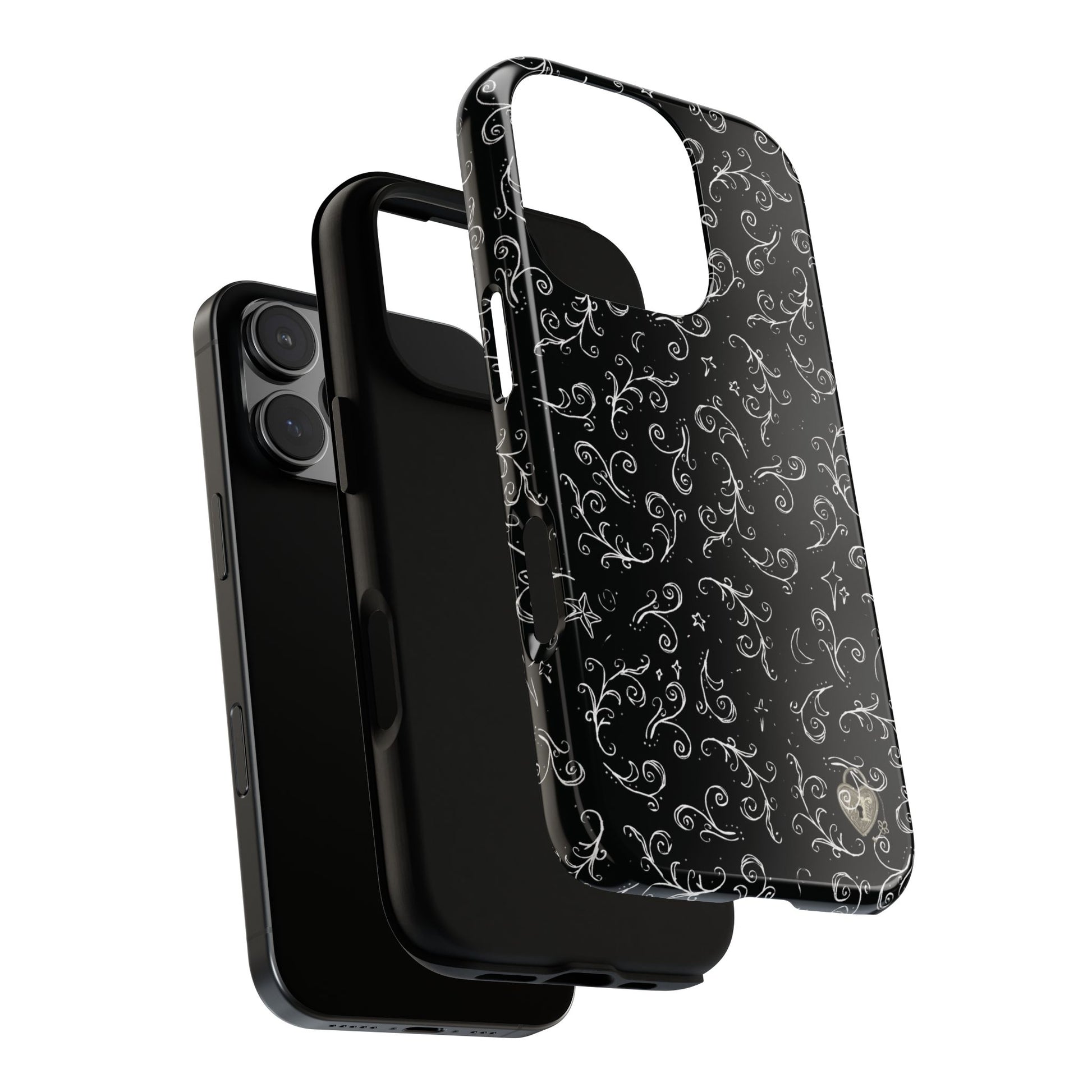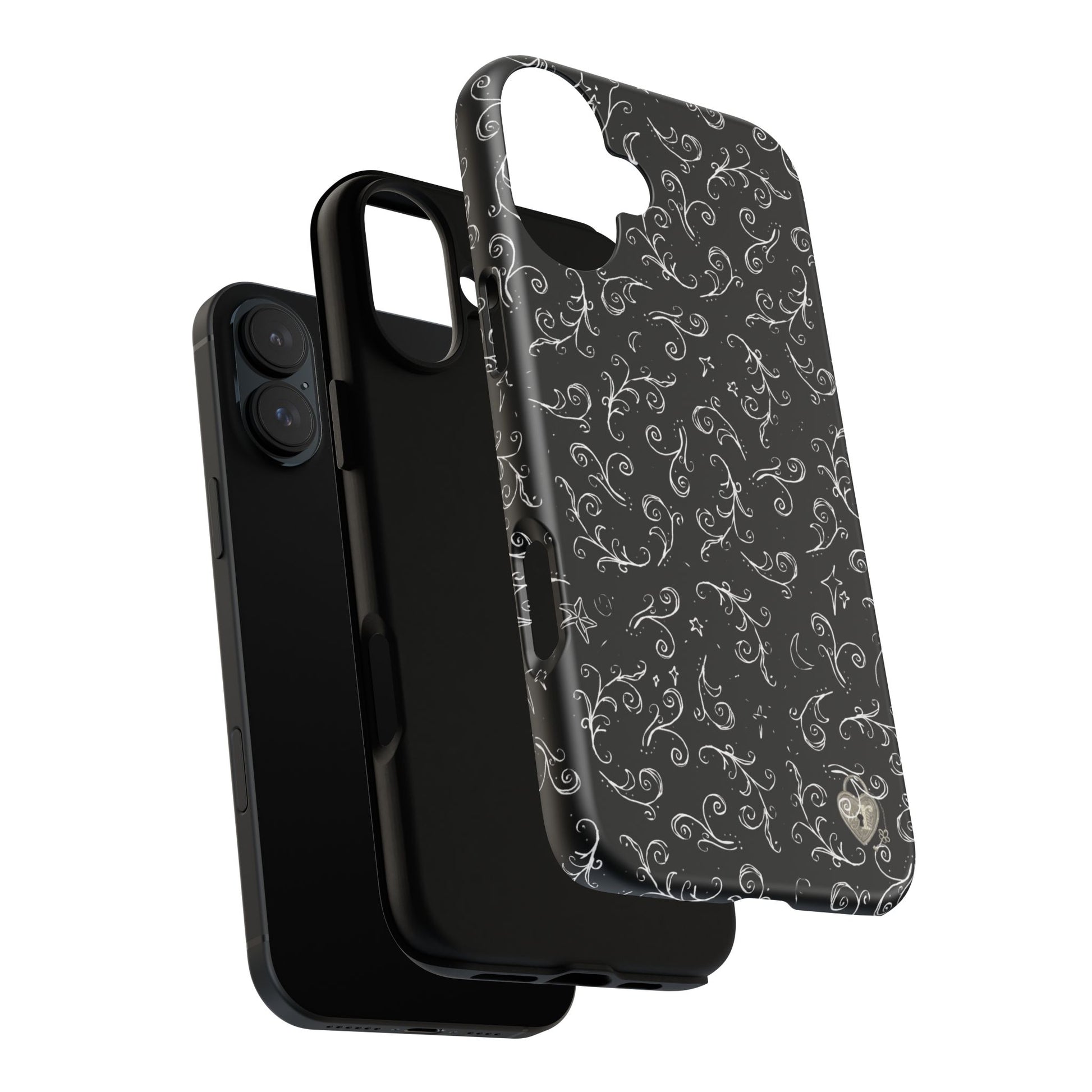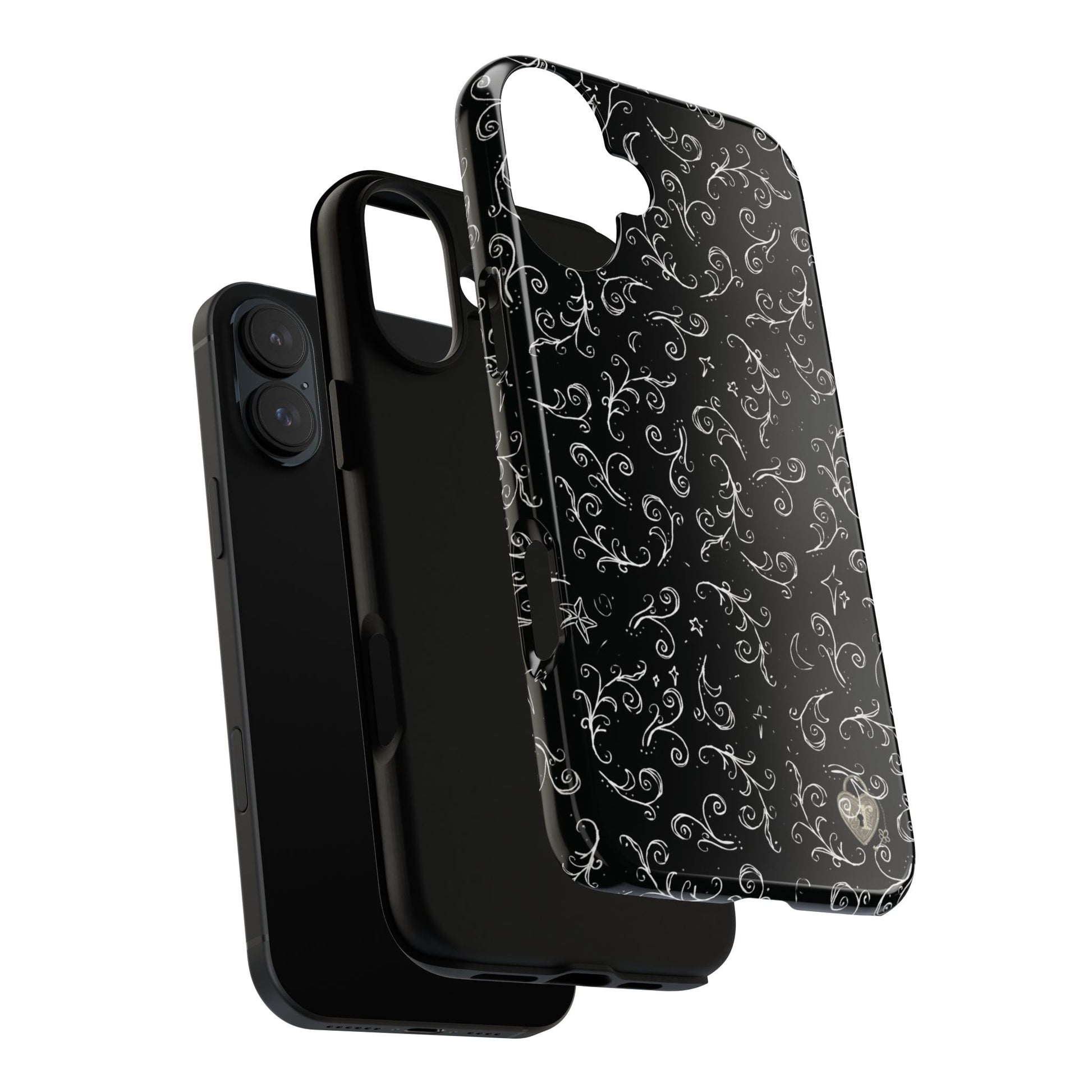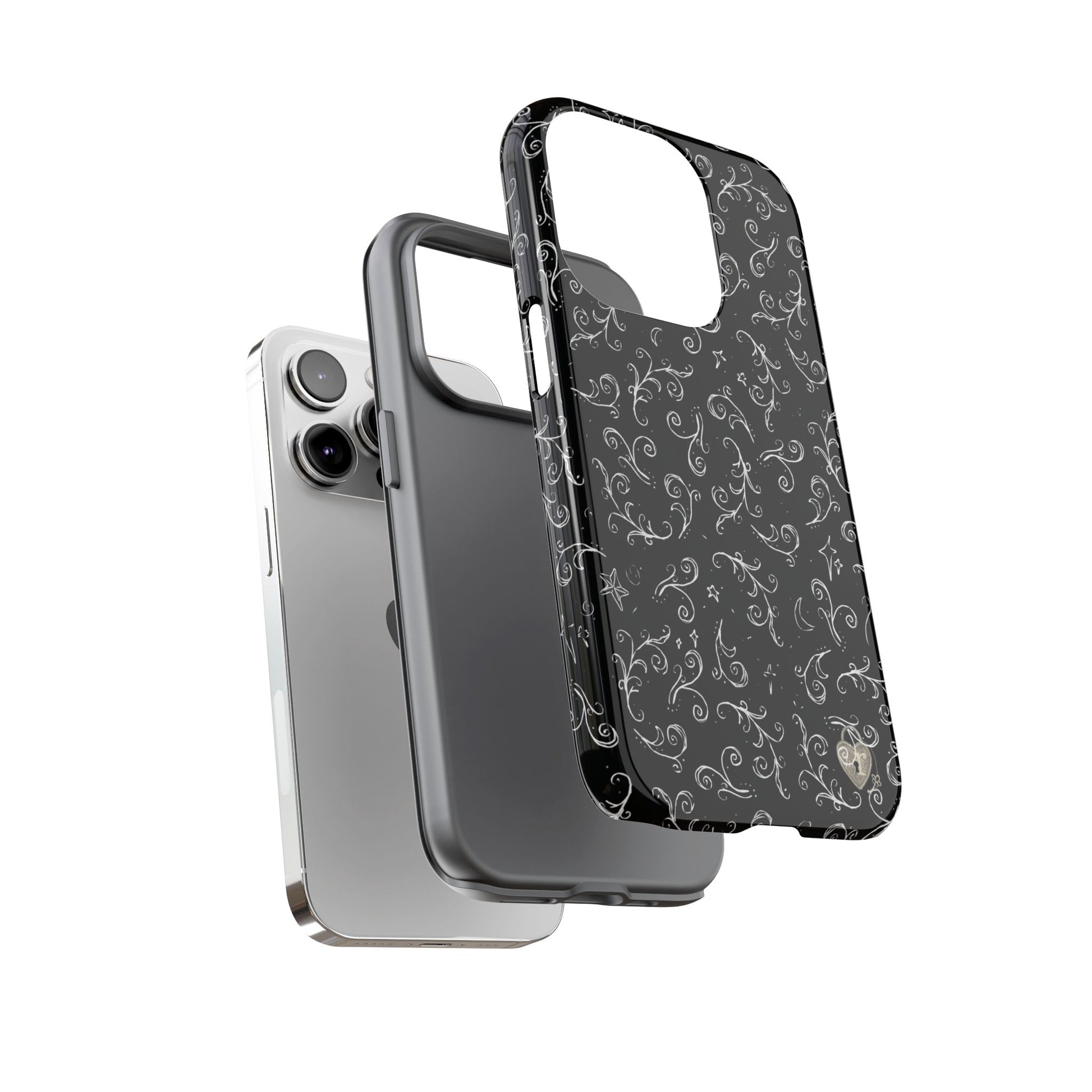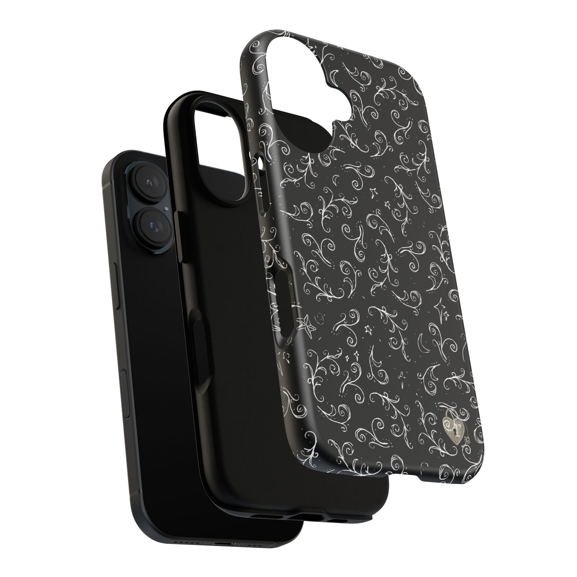 A dark case featuring a swirly and elegant design, alongside small celestial inspired shapes. This case comes in a matte or glossy finish, and sheilds against drops whilst also keeping wireless charging accessible.