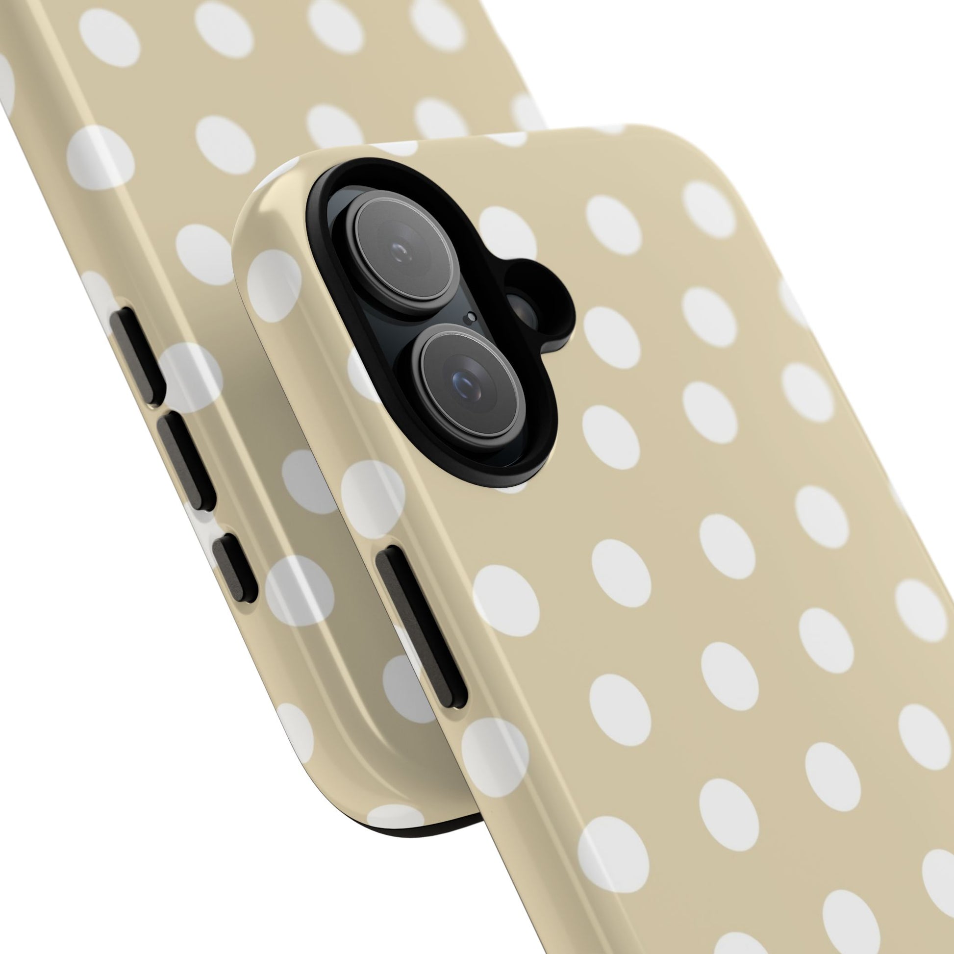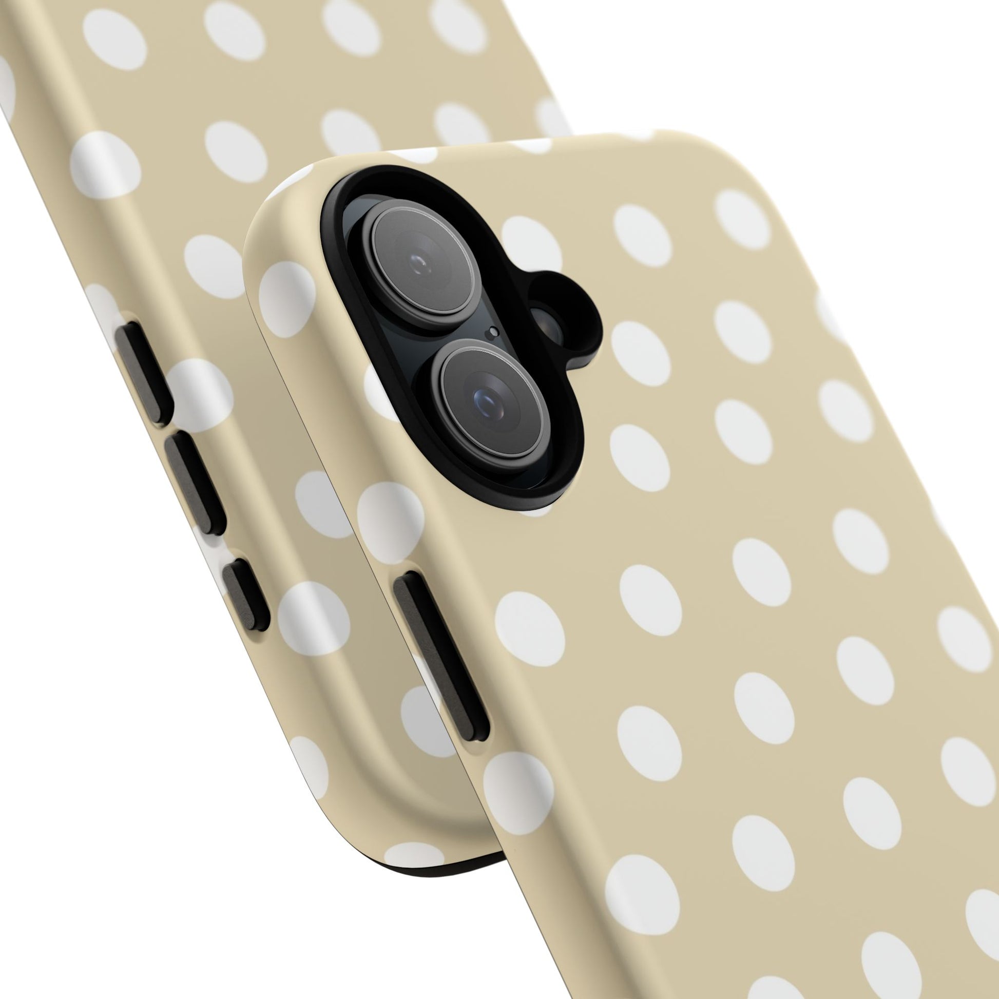 A case featuring a simple polka dot pattern in beige with white dots. This case comes in a matte or glossy finish, and shields against drops whilst also keeping wireless charging accessible.
